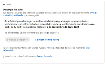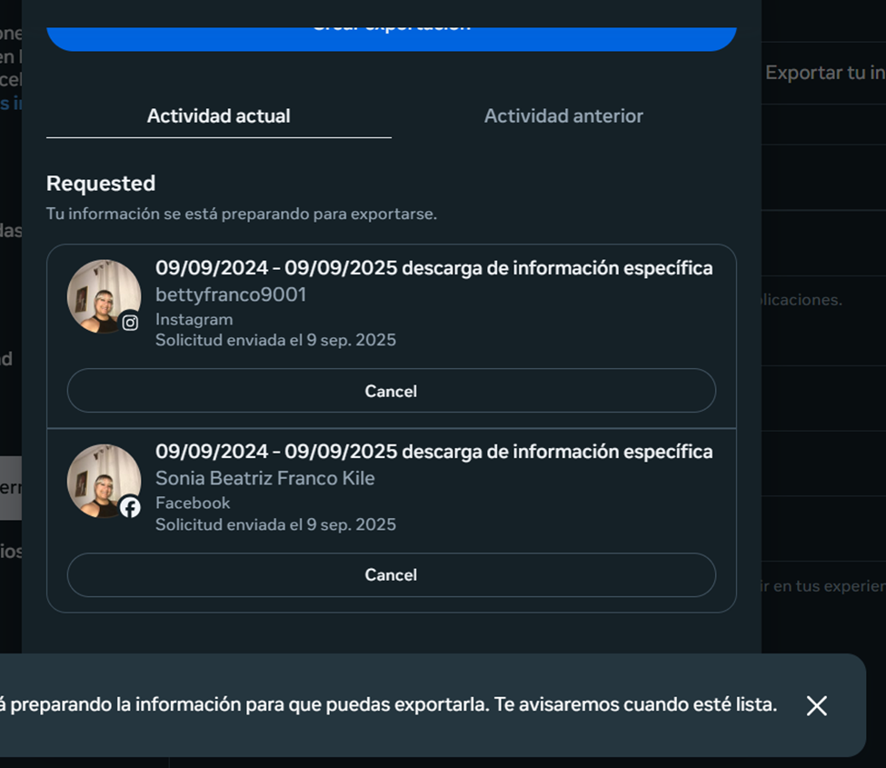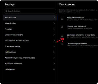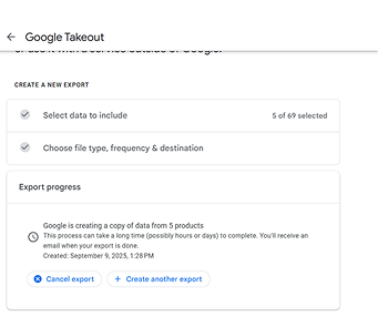 - Confirm what information you want to export, the date range, format (JSON or HTML), and file quality.